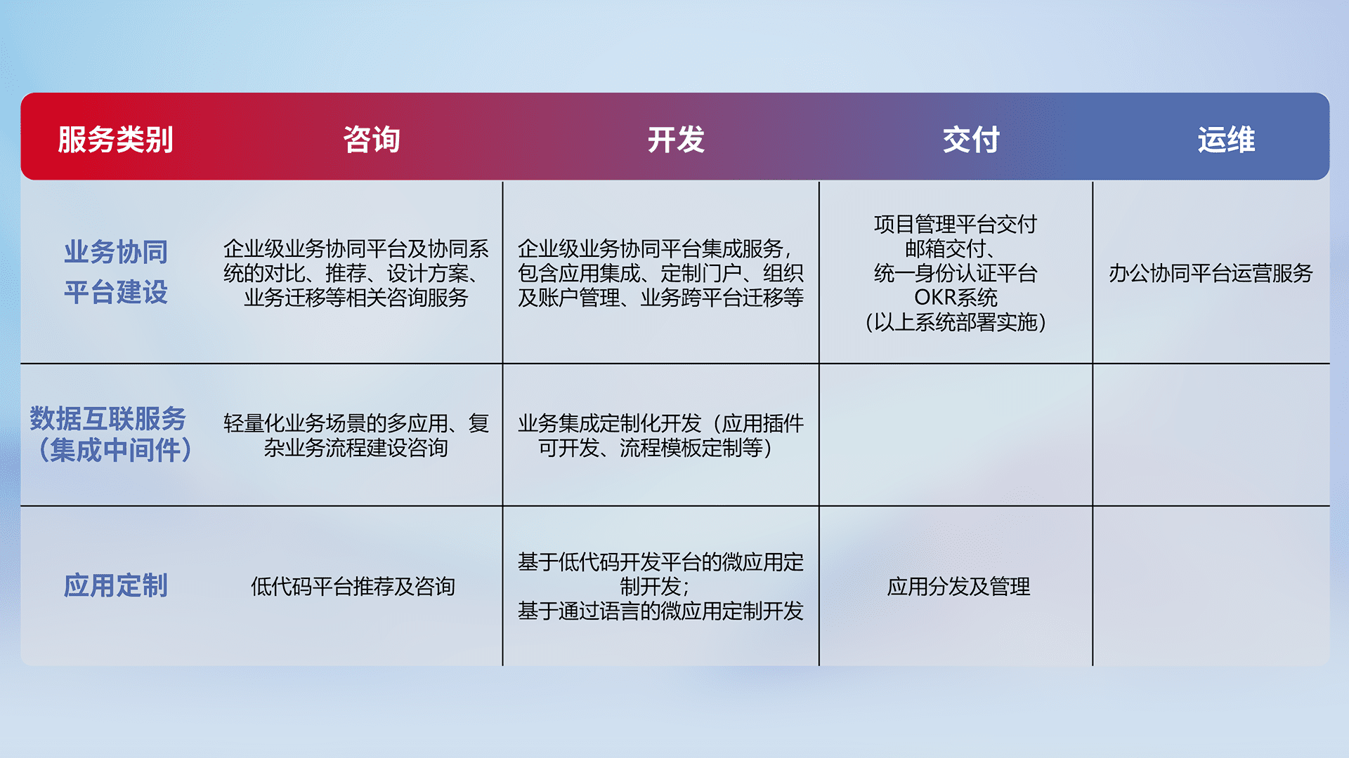 针对钉钉、、企微、、、、IDaas等平台级产品提供产品的规划、、方案、、交付、、、定制化开发等服务,,,,实现如统一协同办公、、智能客户服务、、、、混合会议管理、、智能数据查询、、、、等业务场景,,,,实现数字化转型。。。